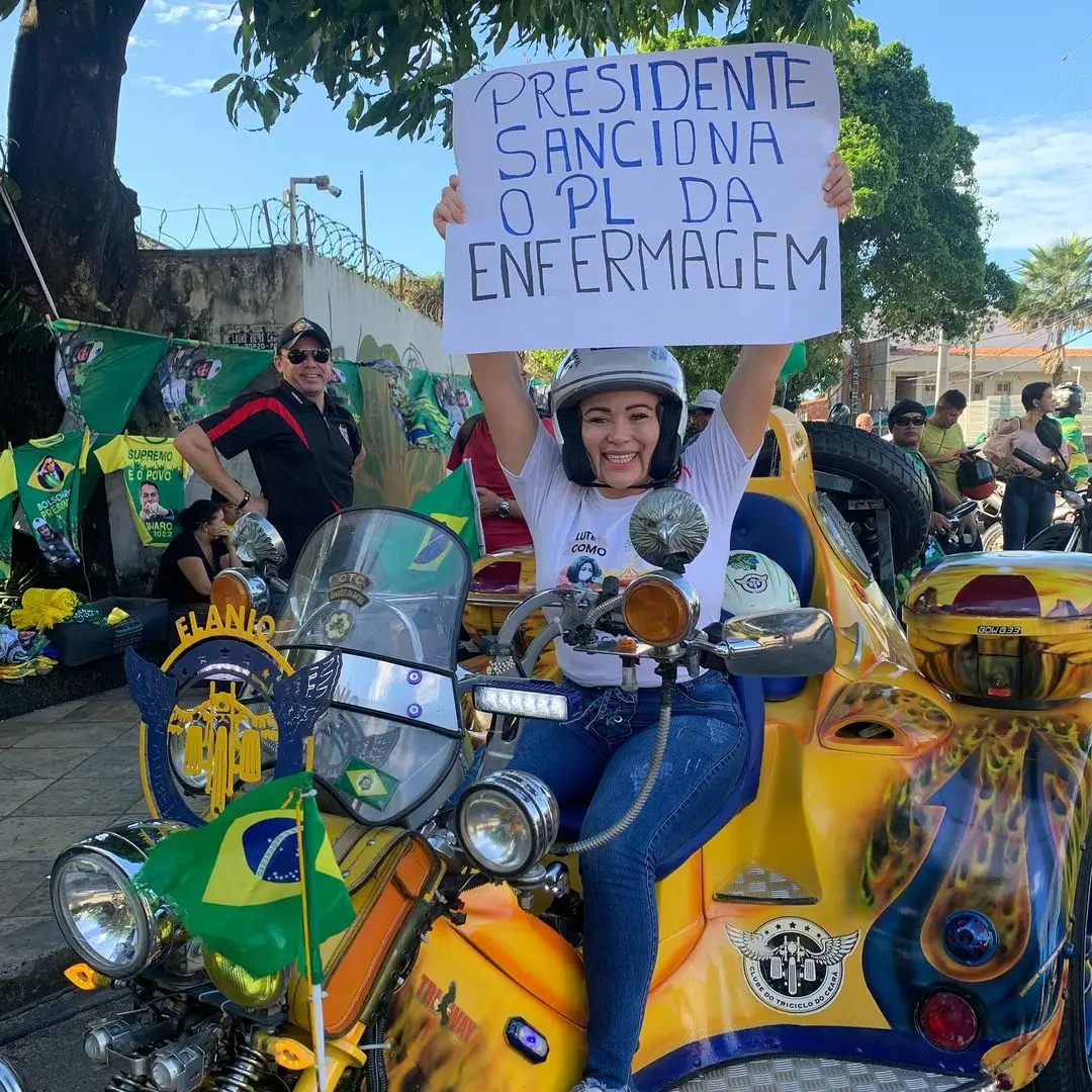 "A Enfermagem está com pressa", diz a parlamentar em uma das postagens. Em vídeo, a vereadora aparece andando em uma moto. Na legenda, ela afirma: "Já estou no ponto! Jair Bolsonaro, sanciona o piso da enfermagem".