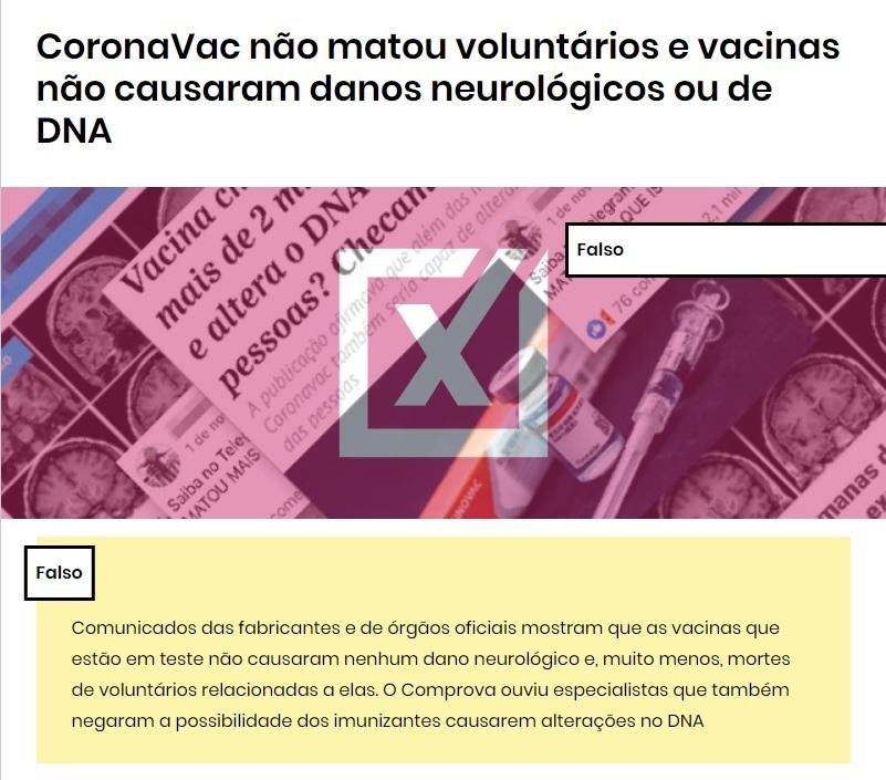 “É um boato totalmente enganoso que a vacina altera o DNA das pessoas, é uma tecnologia utilizada há muito tempo por outras vacinas”, explica. Ela relembra que os estudos da fase 3 da CoronaVac ainda não mostraram nenhum dado científico acerca de danos neurológicos, mas nas fases 1 e 2 não há relatos de problemas do tipo.