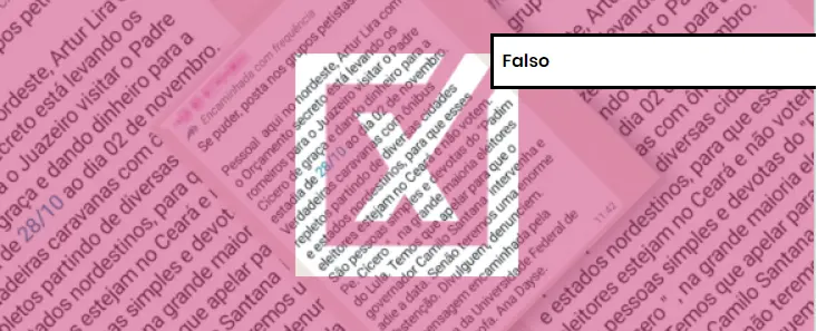 Conclusão do Comprova: É falsa a mensagem que circula no WhatsApp na qual consta que o deputado federal e presidente da Câmara, Arthur Lira (PP-AL), estaria usando verba do orçamento secreto para levar romeiros de cidades do Nordeste a Juazeiro do Norte – município símbolo de devoção ao Padre Cícero, no Ceará –, para uma estadia de 28 de outubro a 2 de novembro em busca de gerar uma possível abstenção no 2º das eleições, que ocorrerá dia 30 de outubro.