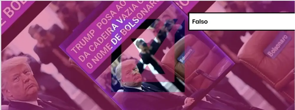 Conteúdo investigado: Post mostra uma imagem do presidente dos Estados Unidos, Donald Trump, sentado ao lado de uma cadeira vazia com o nome do ex-presidente Jair Bolsonaro. “Trump posa ao lado de cadeira vazia com o nome de Bolsonaro”, diz texto inserido acima da imagem.