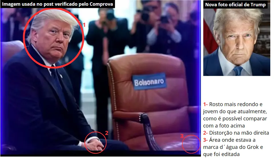 Conclusão do Comprova: É falsa a foto de Donald Trump ao lado de uma cadeira vazia com o nome de Bolsonaro. O resultado de uma busca reversa da imagem, que permite encontrar outras imagens semelhantes, trouxe outro post em que é possível ver, no canto inferior direito, a marca d´água do Grok, ferramenta de inteligência artificial do X que cria imagens sintéticas a partir de comandos de usuários.