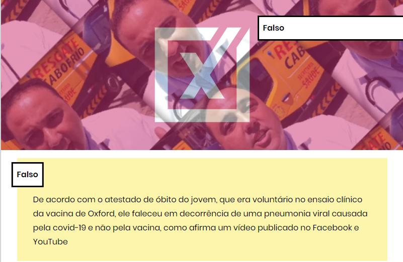 É falso que o médico João Pedro Rodrigues Feitosa, voluntário no ensaio clínico da vacina de Oxford, tenha sido “vítima da vacina”, como afirmou o enfermeiro Anthony Ferrari Penza em uma transmissão ao vivo pelo Facebook. De acordo com o atestado de óbito do jovem, obtido pelo Comprova, ele faleceu em decorrência de uma pneumonia viral causada pela covid-19.
