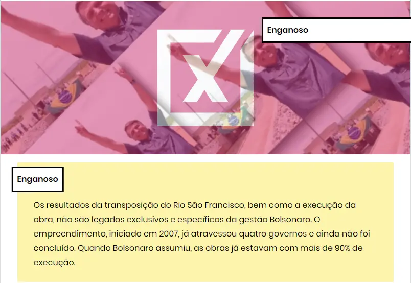 É enganoso o conteúdo de um vídeo produzido pelo Jornal da Cidade Online sobre a transposição do Rio São Francisco e a participação do governo Jair Bolsonaro (sem partido) na execução das obras. O vídeo exalta o mérito do atual governo nos resultados do empreendimento e dá a entender que apenas por conta desta gestão o projeto, executado desde 2007, passou a caminhar para uma conclusão, o que não é verdade.
