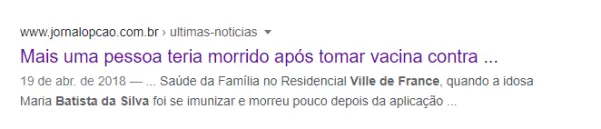 Na notícia, conseguimos mais informações sobre o caso, como o nome completo, “Maria Batista da Silva”, a data e a informação de que o óbito teria ocorrido após a vacinação contra H1N1.