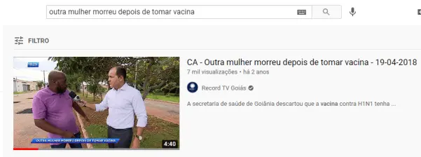Outra informação disponível no vídeo é a tarja animada da matéria, em azul na parte inferior do vídeo: “Outra mulher morreu depois de tomar vacina”. Procurando pela frase no YouTube, o primeiro resultado é o vídeo completo no canal da Record TV Goiás.