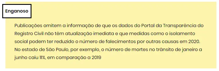 No entanto, nenhuma das postagens enganosas analisadas continha a ressalva de que os números do Registro Civil estão em constante atualização. Em nota, a Arpen-Brasil afirmou que o site é alimentado de “hora em hora” em dias úteis. A entidade diz que a recomendação é de que em análises dos dados disponíveis sejam considerados os números anteriores a um intervalo de 15 dias — contados retroativamente a partir do dia presente.