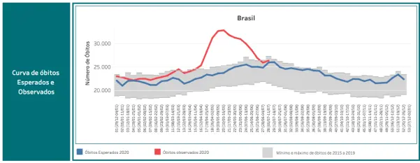 De acordo com Fatima Marinho, há outro fator a ser considerado: todo ano há um aumento de mortes por causas naturais, devido ao envelhecimento da sociedade, mas a covid-19 já superou a mortalidade esperada para 2020. Para ilustrar, ela mostrou um gráfico produzido pelo Conselho Nacional de Secretários da Saúde (Conass). “Normalmente, não temos esse excesso de óbitos no Brasil. Tivemos na época do H1N1, mas foi pequeno. É algo visto em países que têm desastres naturais, como terremotos e tsunamis”, afirma. “Então, estamos atribuindo esse excesso de mortes verificado no Brasil à covid-19.”