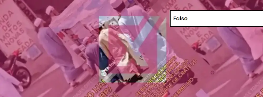Conteúdo investigado: Vídeo utiliza imagens recentes de homens em trajes tradicionais da religião muçulmana andando por uma cidade no interior do Ceará que foram sobrepostas com os dizeres “REBELDES DO HAMAS JÁ ESTÃO NO BRAZIL. NAVIL ESTA ANCORADO NO CIARÁ CIDADE DE CRATEUS” (sic).