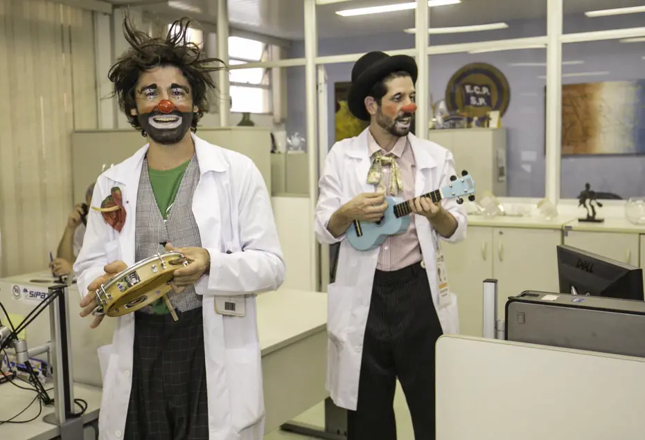 Rostos sisudos, corpos tensos e olhares cansados. Retratos comuns em certos ambientes corporativos. Falta leveza e sobra tensão. Para mudar esse astral, muitas vezes, só rindo. O riso é o tratamento mais eficaz da Associação Doutores da Alegria, que atua não só em hospitais, mas vai às empresas para melhorar o clima organizacional. “Como diz a emérita Dra. Ferrara [membro da trupe], assim como as crianças estão internadas em hospitais, os adultos estão internados nas empresas e nos locais de trabalho”, compara Luis Vieira da Rocha, porta-voz da Associação Doutores da Alegria, que possui unidades nas cidades de São Paulo, Rio de Janeiro e Recife.