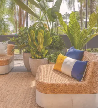 As fibras, naturais ou sintéticas, são muito bem-vindas nos móveis para ambientes externos. Elas dão um toque rústico e elegante ao espaço, se destacando pelas tramas bem elaboradas. As naturais mais encontradas são o rattan, o vime e o junco. As sintéticas são, geralmente, produzidas em plástico, mas possuem beleza semelhante, com a vantagem de serem mais resistentes e oferecerem maior durabilidade às alterações climáticas.
