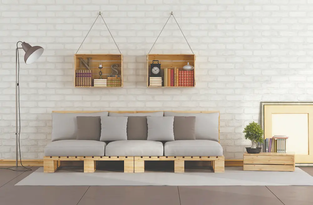Você também pode cobrir o vão com uma chapa de madeira e revestir toda a peça com tecido ou cordas. O resultado é uma peça original e estilosa. Com pallets de madeira você pode compor um sofá bastante confortável, adaptando o tamanho para a dimensão do seu ambiente. A vantagem é ter um móvel muito resistente e durável. Esse tipo de sofá combina com uma decoração leve e natural. O assento pode ser feito com almofadas ou um colchão que não se usa mais.