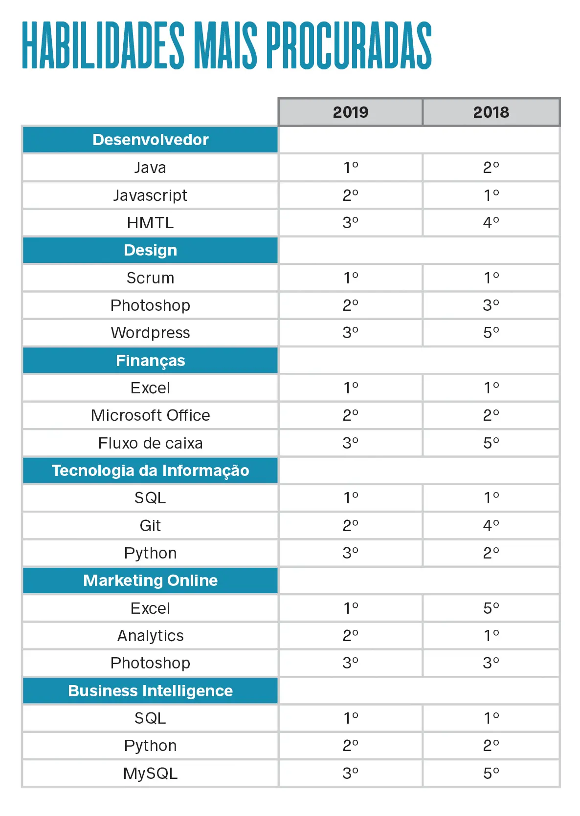 Confira a seguir a lista com as habilidades mais procuradas em 2019, de acordo com levantamento feito pela Revelo: