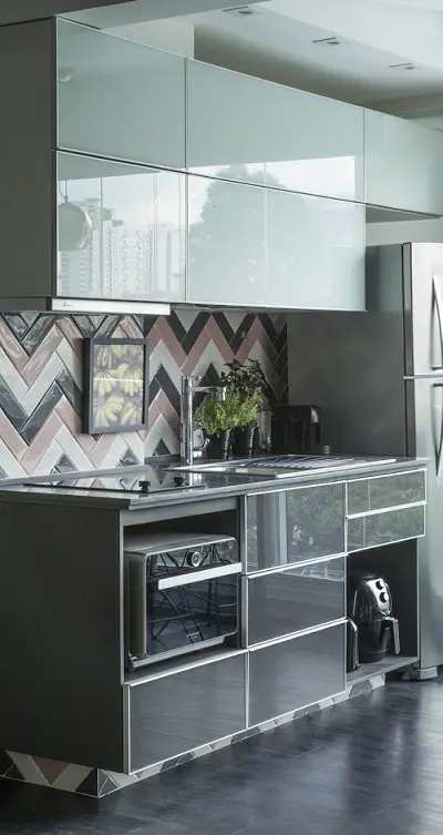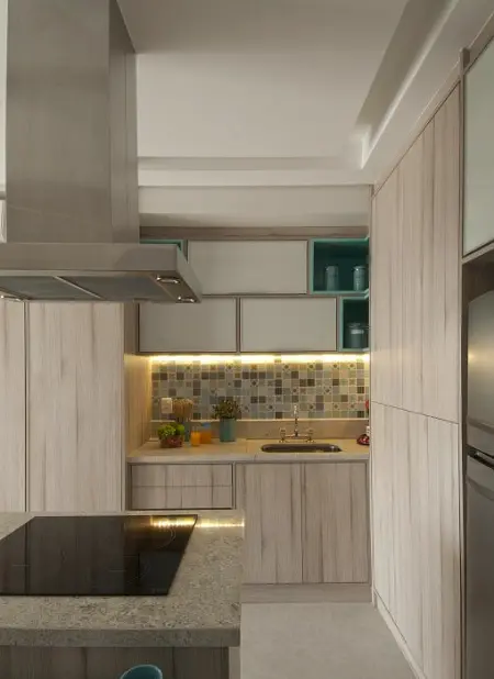 Para os apartamentos compactos, tendência bastante presente no Ceará, Erika Mello e Renato Andrade apostam em marcenaria sob medida. O objetivo é aproveitar as paredes da cozinha até o teto, conquistando mais área e armários.