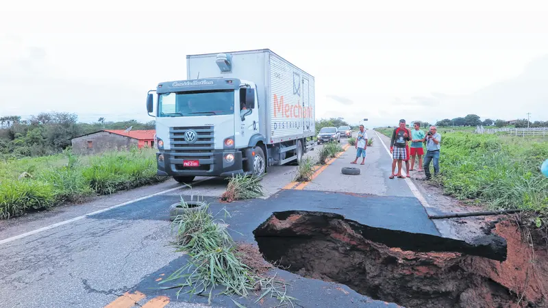 Foi a primeira vez neste ano a chover com mais intensidade no Sertão Central. O suficiente para encher várias barragens da região e ainda provocar estragos. O dia amanheceu dando um susto nos moradores da localidade de São Paulo, à margem da BR-122, a pouco mais de 10Km da sede de Ibaretama. Motoristas e motociclistas que seguiam para o Interior ou retornavam para a Capital também ficaram assustados. Um enorme buraco se abriu engolindo metade da rodovia federal, à altura do Km 67. Preocupada, a vizinhança utilizou pneus velhos, pedaços de madeira e até mechas de capim para sinalizar o perigo.