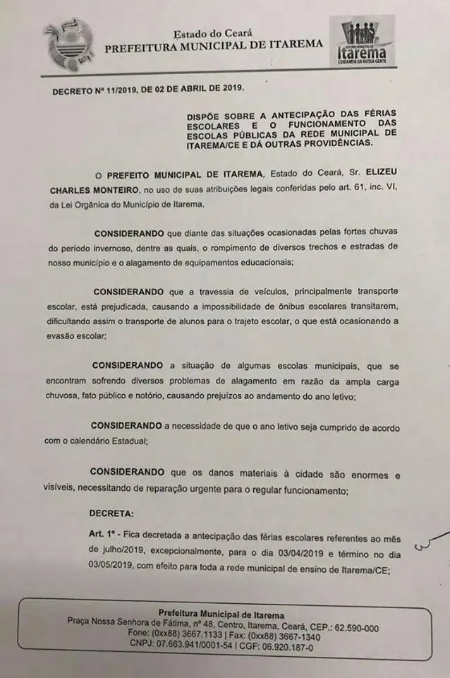 Cerca de 8 mil estudantes da rede municipal e estadual de Itarema, cidade localizada no Litoral Oeste do Estado, entram de férias a partir de hoje (3). A medida foi tomada pelo prefeito Elizeu Charles Monteiro, por meio da assinatura do decreto nº 11/2019. No documento, que antecipa as férias das escolas de julho para o mês de abril, ressalta os problemas que o município vem passando por causa das fortes chuvas, como o “rompimento de diversos trechos de estradas" e o "alagamento de equipamentos educacionais”.