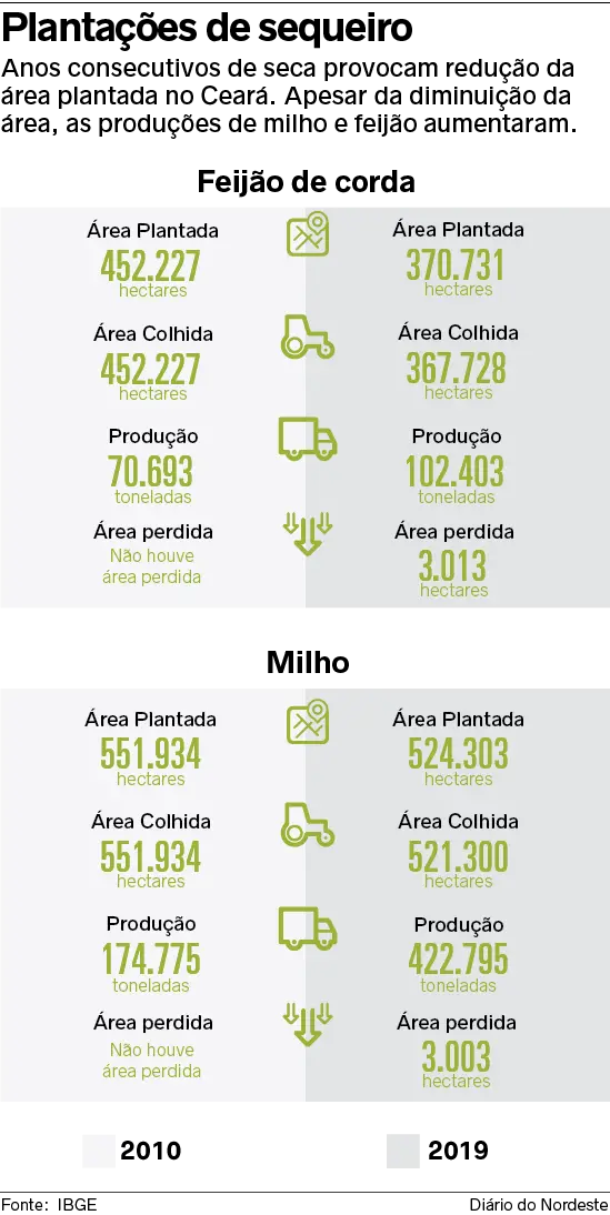 Nos últimos nove anos, houve redução da área de plantio no sertão cearense, segundo o IBGE. Em 2010, foram cultivados 452.227 hectares de feijão de corda e 551.934 de milho. Já em 2019, a área plantada de feijão de corda caiu para 370.731 hectares e a de milho para 524.303. Ainda assim, não se observa queda geral na produção do Estado. De acordo com Regina Dias, supervisora estadual de estatísticas agropecuárias do IBGE, apesar de maior área de plantio em 2010 em comparação com 2019, a menor produção naquele ano decorre de perda da safra por causa da seca. "Em 2010, o Ceará enfrentou uma seca grande, houve perda elevada da safra de grãos de sequeiro", lembrou a supervisora.