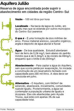 Após a perfuração de seis poços e testes de vazão de pelo menos 24 horas com liberação regular média de 100 mil litros por hora, geólogos da Secretaria de Agricultura, Pecuária e Desenvolvimento Rural de Iguatu, na região Centro-Sul do Ceará, confirmaram a existência de um aquífero na Bacia da Lagoa do Julião com cerca de 642 km², que se estende a outros municípios.