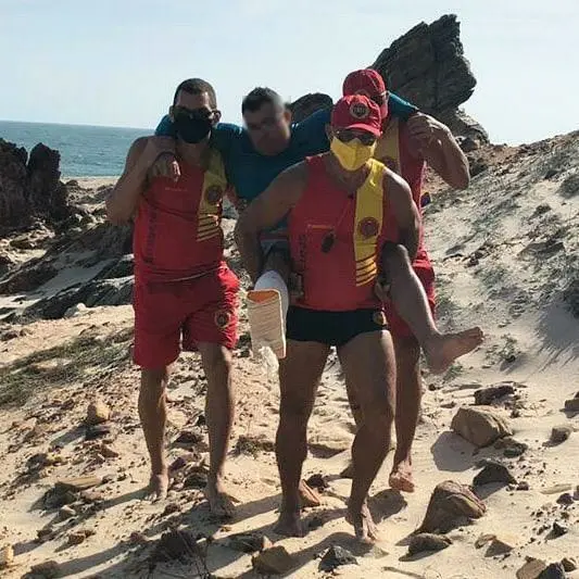 Guardas vidas que estavam de serviço na praia foram acionados para socorrer a vítima, que possivelmente tinha sofrido uma fratura na tíbia.