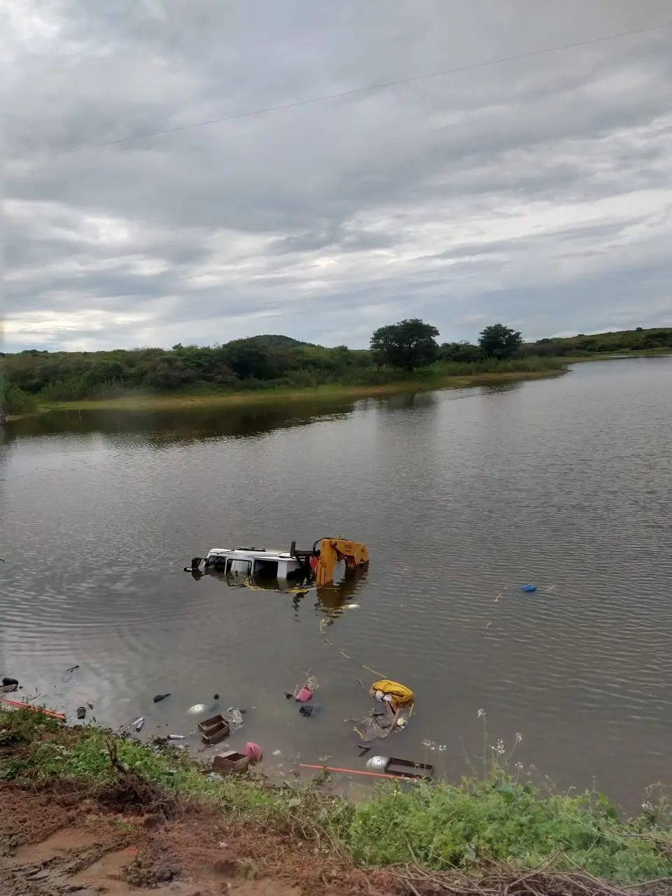 Caminhão da Enel cai em açude na zona rural de Tamboril