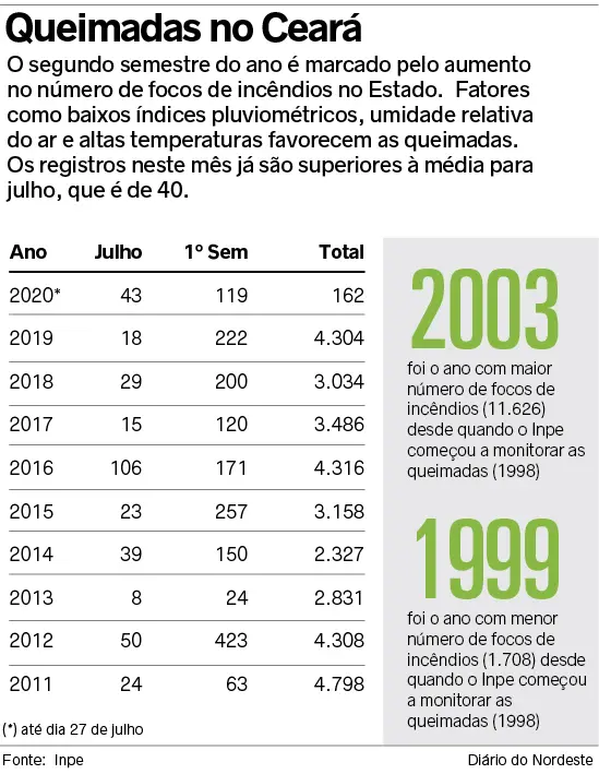 Historicamente, o segundo semestre do ano concentra o maior número de queimadas do Ceará. Neste mês, já foram pelo menos 43 focos de incêndio, acima da média histórica para o período, de 40 registros. Os dados são do Mapa de Queimadas, do Instituto Nacional de Pesquisas Espaciais (Inpe). Seguindo a série histórica observada no Ceará, a partir da próxima semana os números tendem a aumentar ainda mais. Em 2019, os meses de agosto a dezembro concentraram 94,4% do total de focos do respectivo ano. Em 2018, este percentual foi de 92,4% e, em 2017, de 96,1%.