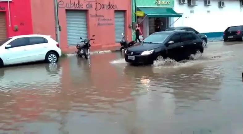 Em Cedro, região Centro-Sul, as ruas também ficaram cheias de água, dificultando a passagem de veículos e pedestres.