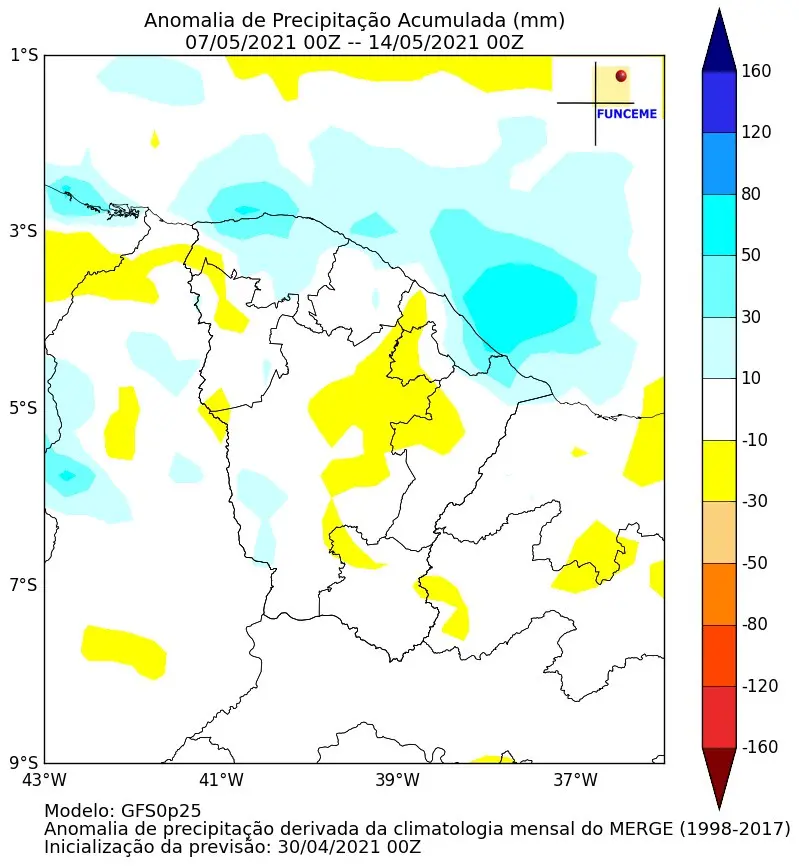 No entanto, a partir da segunda semana, as precipitações tendem a se concentrar mais na faixa litorânea "com volumes acumulados girando em torno da normal climatológica". para maio, a média é de 90,6 mm, abaixo das médias de abril e março.
