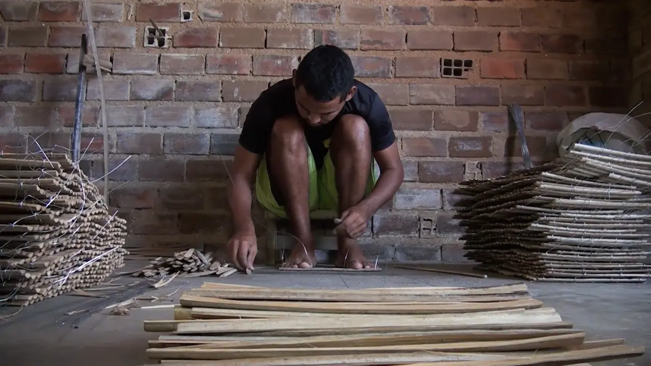 Luís Alexandre, 45 anos, é um dos trabalhadores de ‘casas de covos', como são conhecidas as oficinas artesanais de confecção das armadilhas. Ao lado da casa de morada, diariamente o pescador e artesão faz o trabalho manual. “A gente mesmo é que retira a matéria-prima, as talas de carnaúba, que são cortadas e trazidas para as oficinas”, explicou.