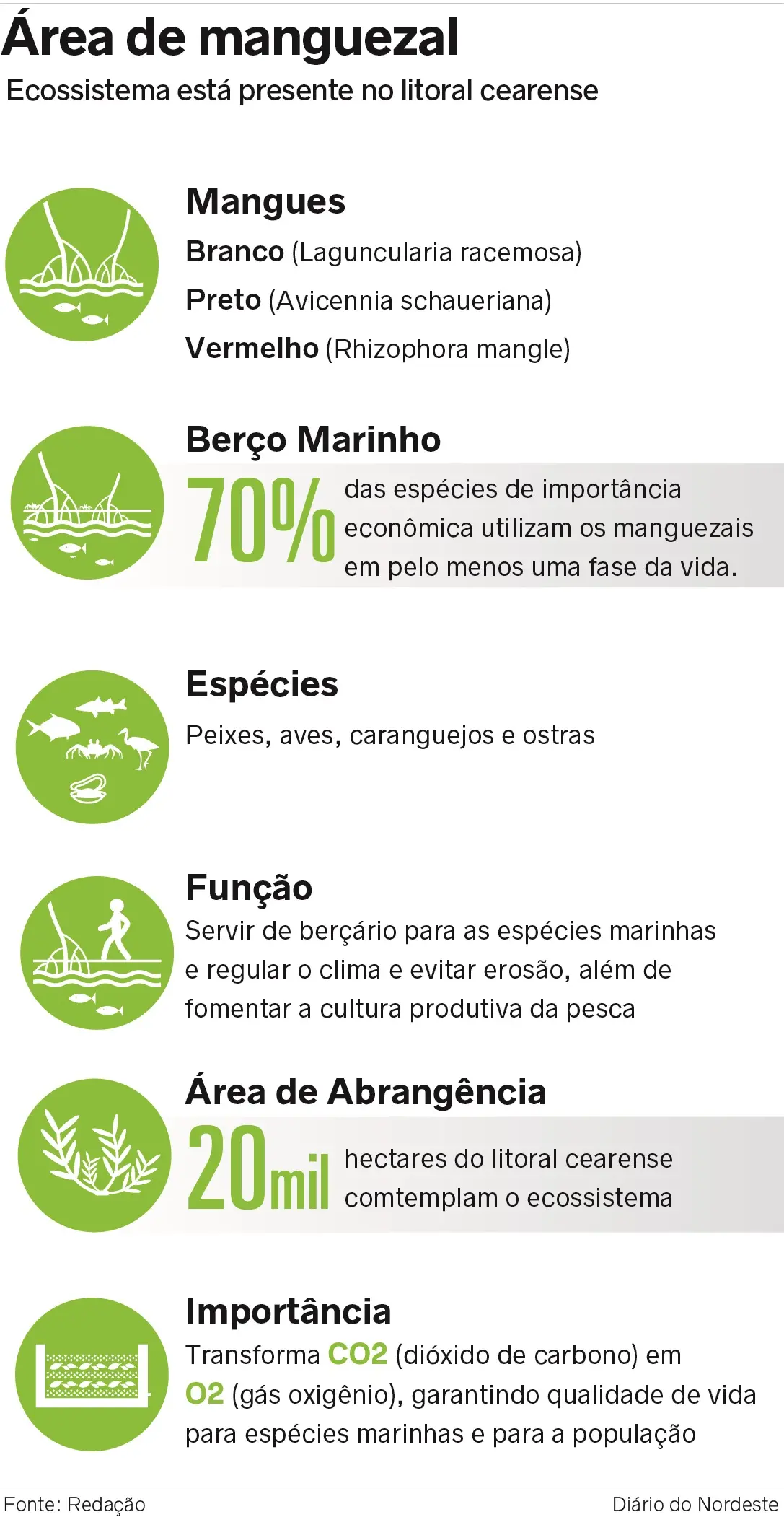 Em 2019, o litoral nordestino sofreu com o derrame de óleo, que acabou chegando, também, às praias cearenses. Rusty Sá Barreto, gestor e educador ambiental no Ceará, explica que, neste cenário, os manguezais tiveram uma função fundamental de diminuir a força das ondas, evitando que mais óleo chegasse às faixas de areia. Segundo um estudo inédito, os ecossistemas estão presentes em pelo menos 22 municípios cearenses, ocupando cerca de 20 mil hectares.