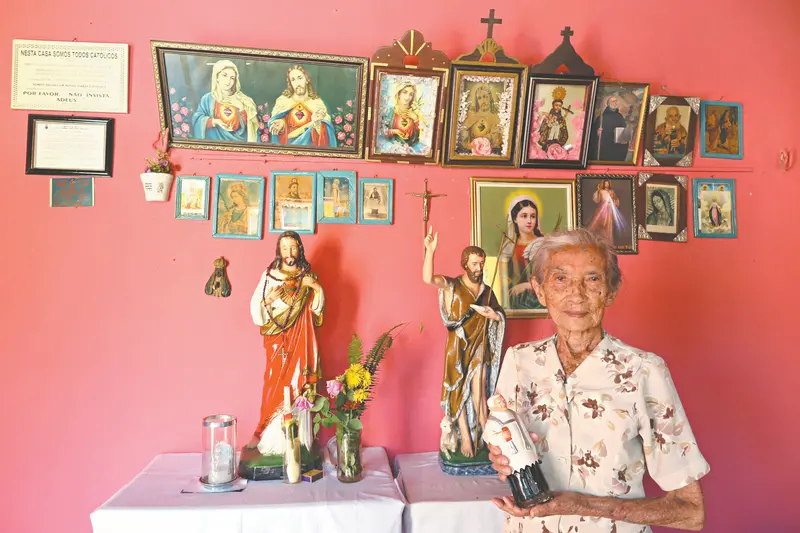 Com a chegada à Capital da Fé, como Juazeiro é conhecida, a religião cresceu na vida daquela família alagoana. A senhora de estatura pequenina, com aparência saudável e de uma vitalidade impressionante, incomum para a idade que ela tem, recorda que a primeira imagem foi dada por um padre, durante uma romaria. Passados 86 anos, o presente permanece intacto no centro da sala, ao lado de outras tantas imagens. "Este foi o primeiro", ergue o dedo apontando o Sagrado Coração de Jesus. "Hoje tem uma centena, para onde olhar, vai encontrar um santo. Me sinto bem, como se minha fé fosse renovada a cada dia", acrescenta.