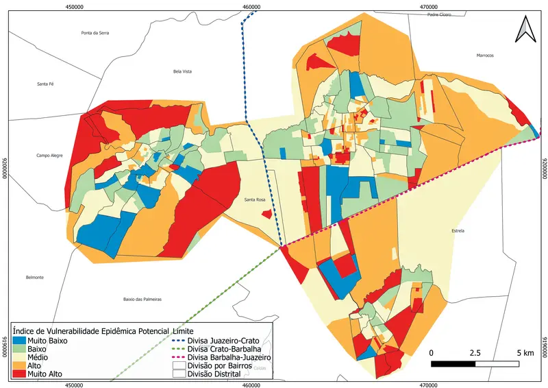 Os indicadores utilizados são distribuição de renda; pessoas em situação de pobreza ou extrema pobreza; densidade populacional; domicílios sem abastecimento de água e banheiro; ausência de infraestrutura urbana; e densidade domiciliar. Com estas informações, foi criada o Índice de Vulnerabilidade Epidêmica Potencial (IVEP). Em Juazeiro do Norte, os bairros Frei Damião e João Cabral apresentam um índice 'Muito Alto'. Já no Crato, o mesmo resultado aparece no Sítio Barro Branco, no bairro França Alencar e nos distritos de Monte Alverne e Santa Fé. Por último, em Barbalha, causa preocupação o distrito de Caldas e o bairro Mata dos Limas.
