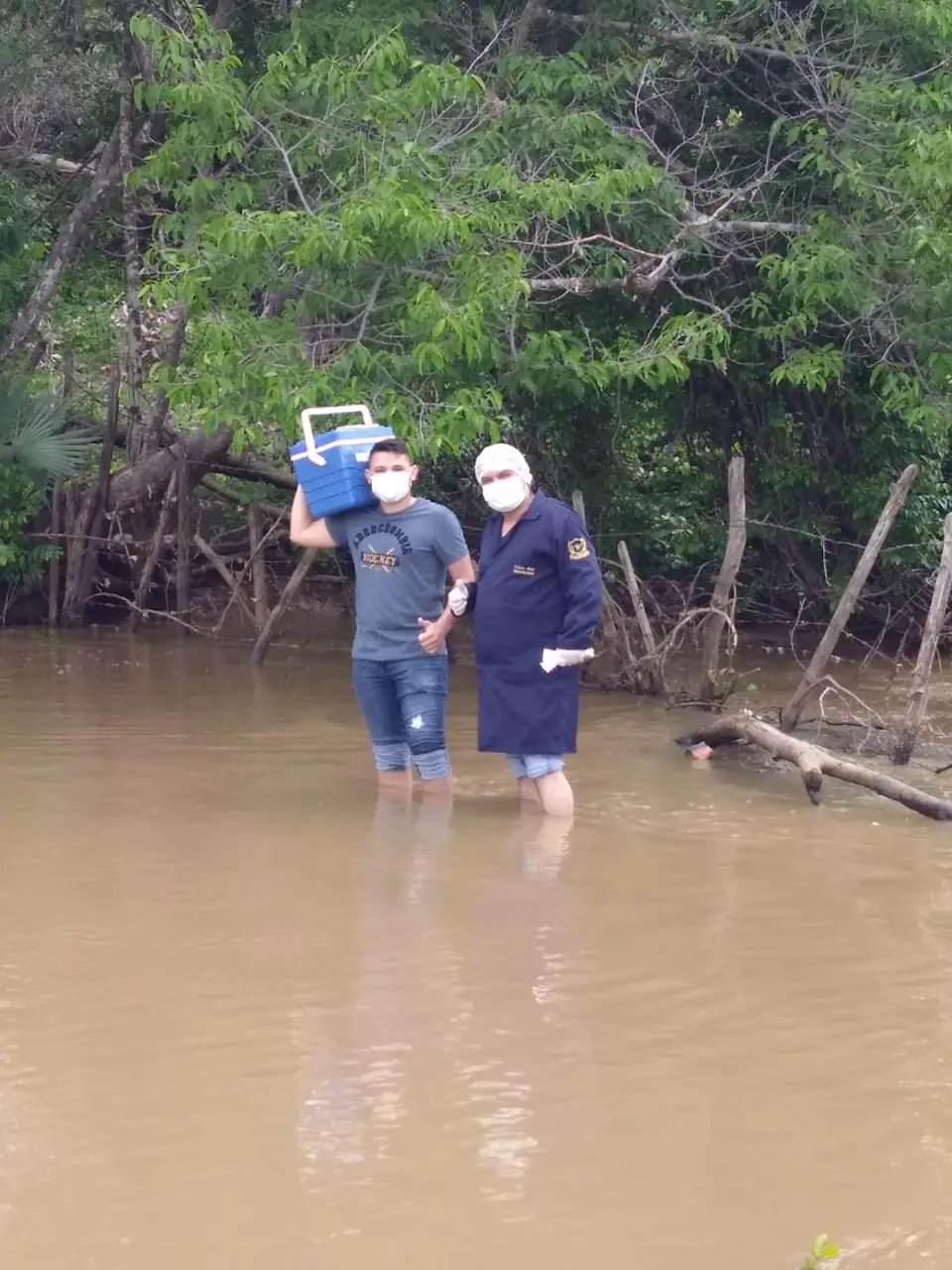 Com água pouco abaixo do joelho e a caixa térmica no alto, por sobre o ombro, Estênio seguiu a passos lentos e cuidadosos por 100 metros até chegar à outra margem do rio. “Choveu muito de terça-feira para quarta (dia 24), não tinha outra saída, como não passava nenhum veículo, a gente atravessou a pé e se tiver que atravessar outros, farei novamente”, conta o enfermeiro.