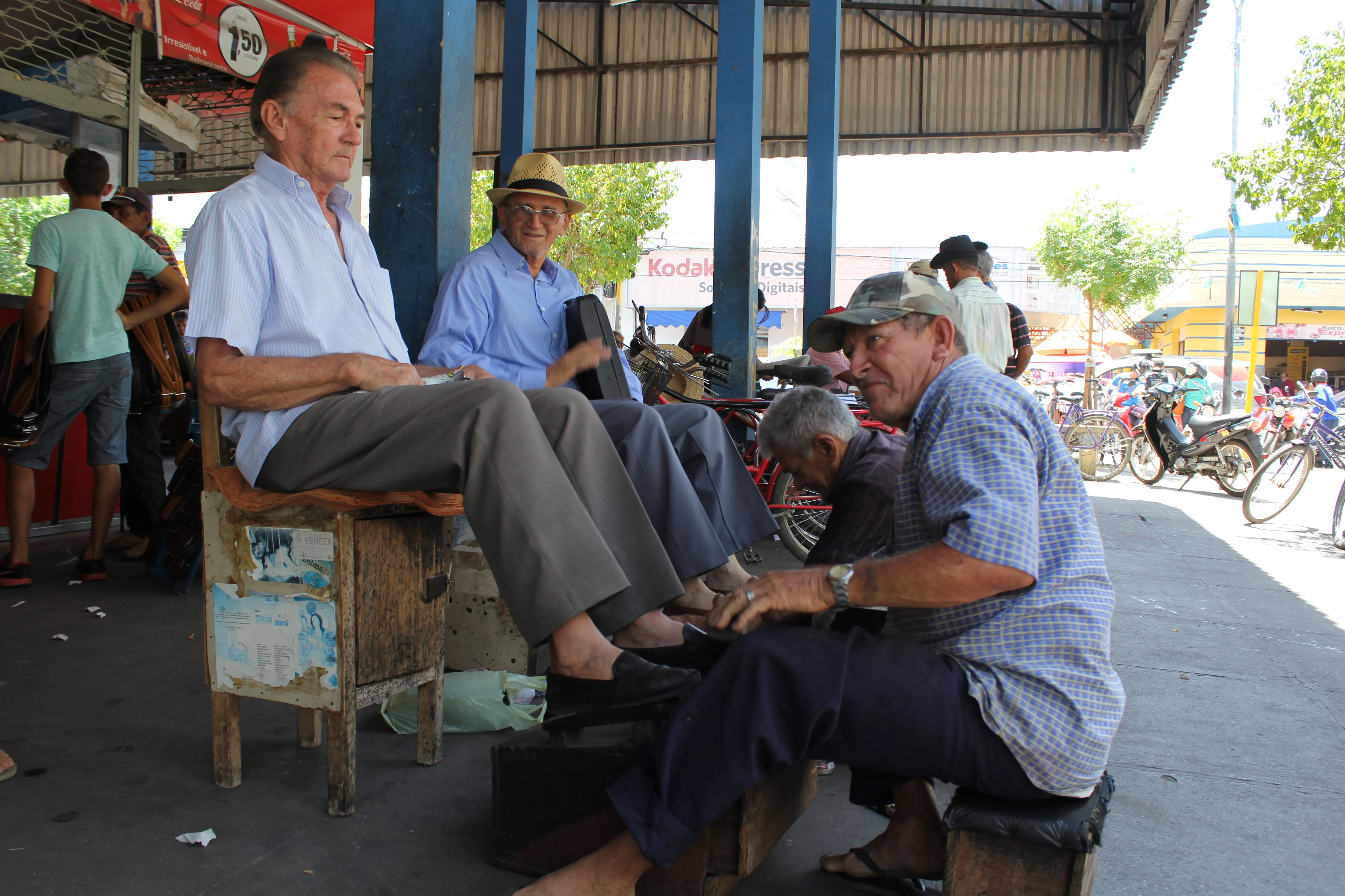 A dupla permanece diariamente na praça Demóstenes de Carvalho, o conhecido ‘Abrigo’ onde há um serviço de café tradicional que acolhe visitantes, aposentados e trabalhadores do centro comercial. “Antigamente, eram uns oito, um ao lado do outro, com suas cadeiras, e não faltava cliente”, lembrou Adão Alves Damasceno, 72 anos.