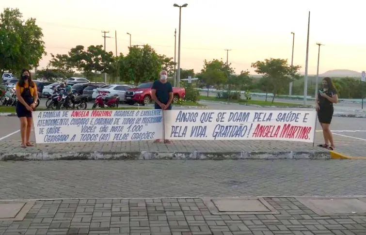 Ao ser informada com a notícia de que a paciente Angela Martins, 57, receberia alta do Hospital Regional do Sertão Central (HRSC), em Quixerabobim, no interior do Ceará, a família da agricultora surpreendeu, na tarde de domingo (7), a equipe da unidade de saúde com uma mensagem de agradecimento pelo tratamento que ofereceram a ela, que se recuperou da Covid-19 no local. Com faixas na mão, escreveram: "Vocês são nota 1.000".