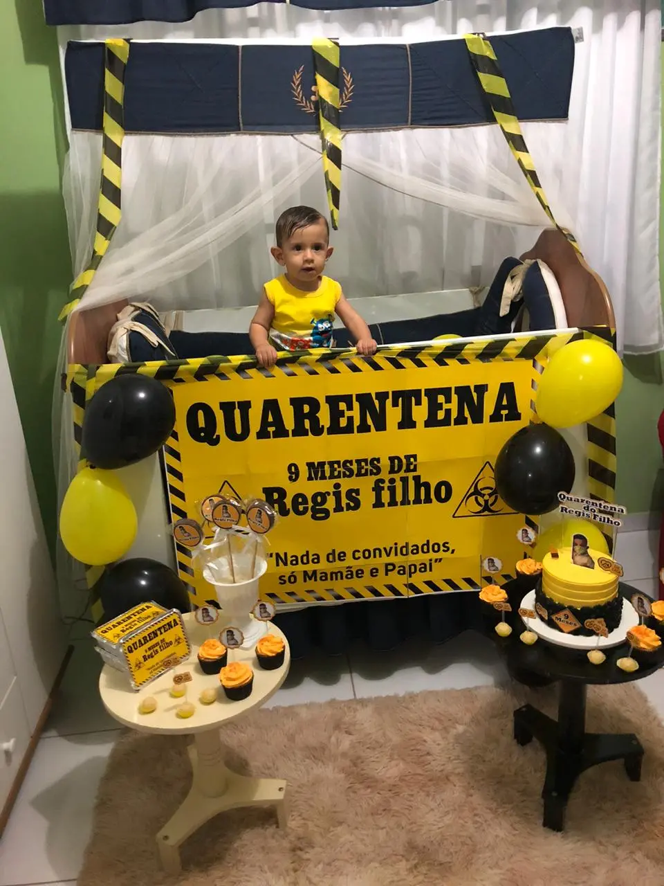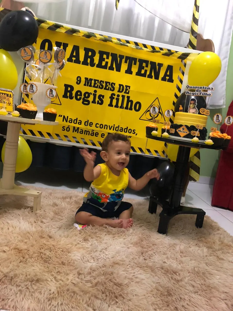 A decoração temática incluiu fotos do bebê usando máscara, o cartaz com a advertência contra aglomeração, e a família ainda enviou para os convidados virtuais marmitas da "quarentena do Regis Filho" como lembrancinhas.