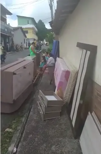 “Começou domingo o portão baixar. Aí perceberam que todas as calçadas tavam afundando. Na quarta, a cerâmica da mulher começou a cair, a laje. Os dois prédios dela entortaram e o nosso começou a rachar. Rachou tudo, tanto que o teto já tá baixando. A gente pisa e já tá fofo”, relata.
