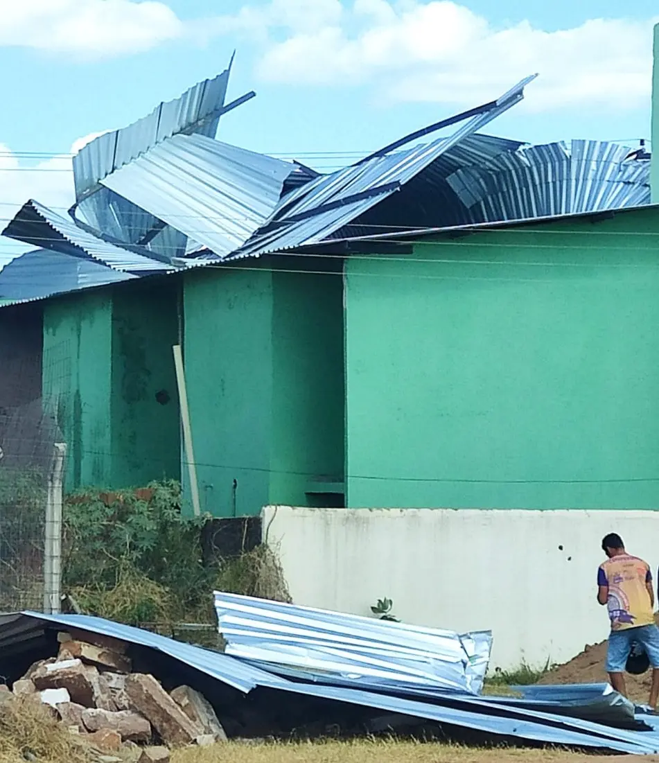 Uma ventania forte atingiu, na tarde de ontem (16), o prédio do antigo Hotel Municipal de Brejo Santo, no Cariri cearense, arrastando parte do telhado do prédio, que está em obras. O episódio assustou pedestres e motoristas, já que a estrutura foi parar próxima da BR-116, rodovia vizinha ao local. A empresa responsável pela reforma do prédio garantiu, em nota, que já está recuperando o teto e que foi “redobrada a atenção a todos os cuidados na fixação".