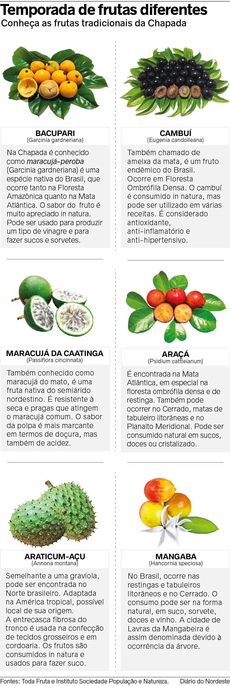 O popular pequi, protagonista das refeições do Cariri cearense, 'ofusca' uma diversidade de frutos nativos da Chapada do Araripe presentes no cotidiano das comunidades daquele território. Maracujá-peroba, maracujá-boi, cambuí, araçá, araticum e mangaba são alguns exemplos de alimentos que também fazem parte da economia e da culinária local. Apesar da grande quantidade colhida, o potencial desta riqueza natural ainda é pouco explorado, até mesmo pelos moradores.