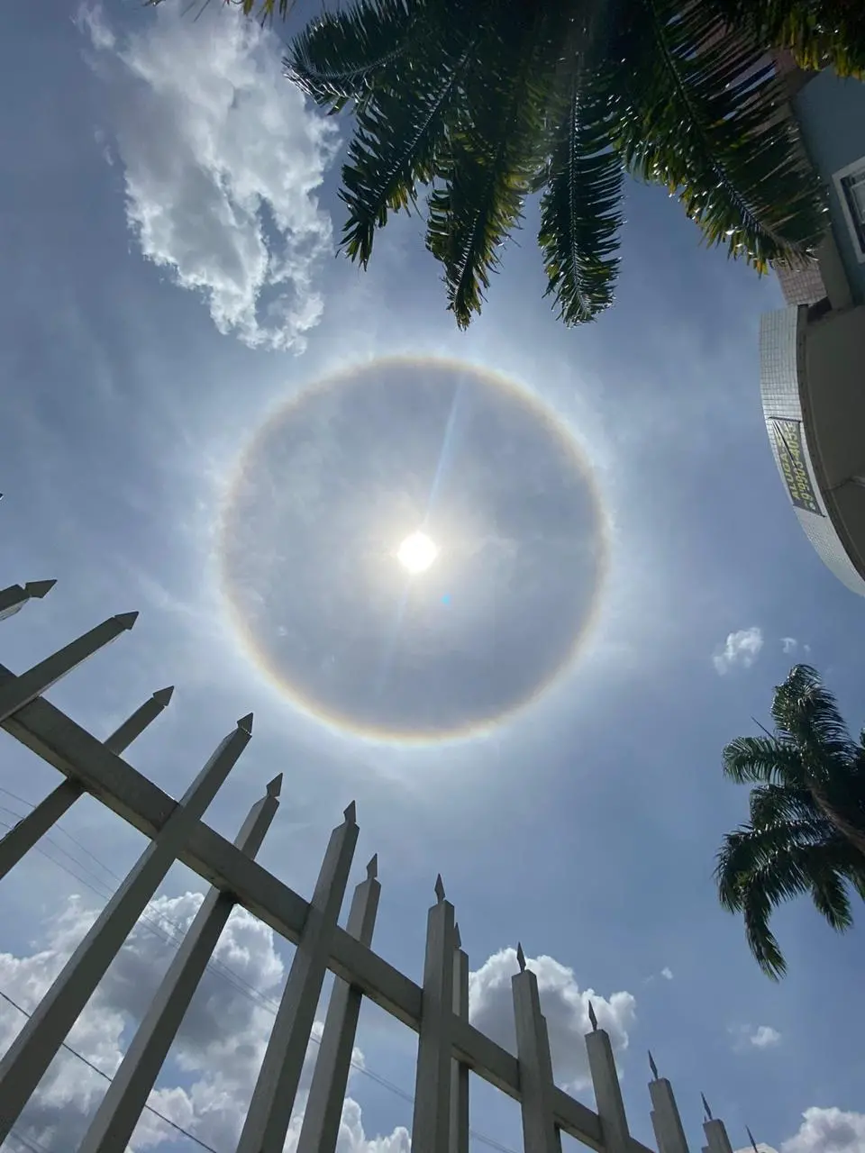O imenso círculo colorido ao redor do sol é chamado pelos meteorologistas como ‘halo solar’. A sua formação “decorre do aumento de umidade na atmosfera, formação de cristais de gelo suspensos no ar e nuvens elevadas que carregam as partículas úmidas e ocorre a refração da luz solar em forma de círculo colorido”, conforme explicou o meteorologista do Instituto Nacional de Meteorologia (Inmet), Flaviano Rodrigues.