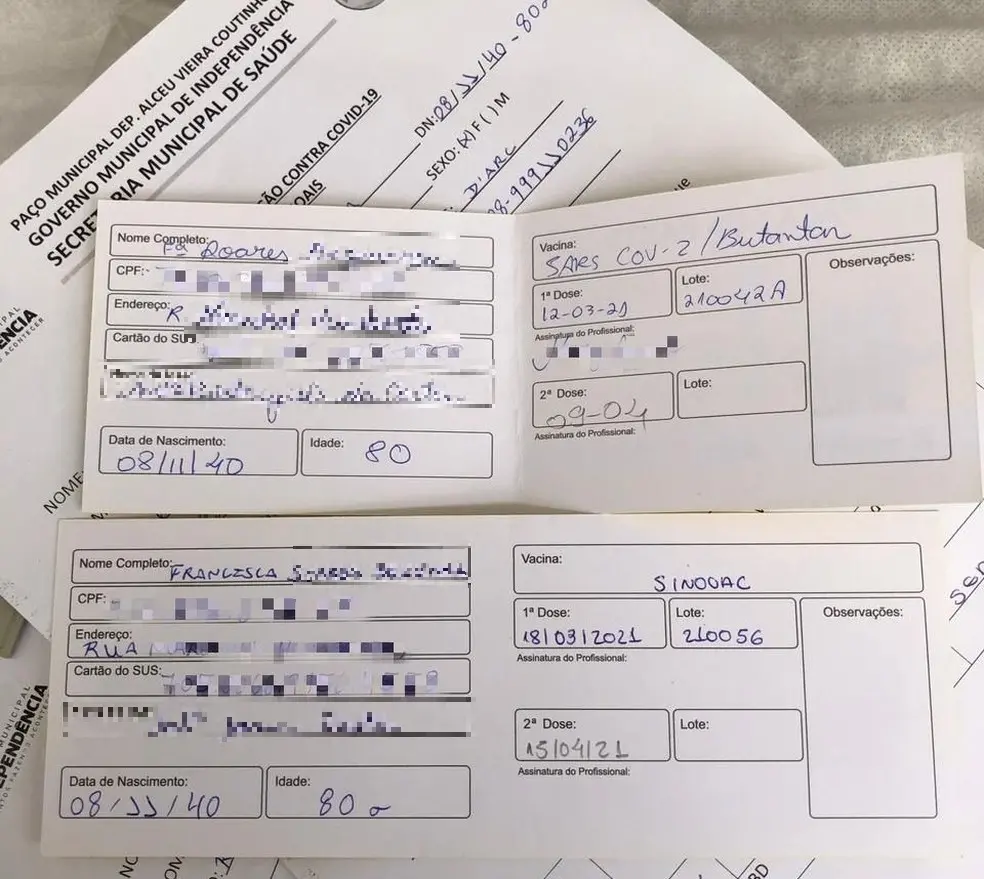 Em um intervalo de seis dias, uma mulher de 80 anos recebeu duas doses da vacina CoronaVac — produzida pelo Instituto Butantan em parceria com a farmacêutica chinesa Sinovac —, em Independência, no interior do Ceará.