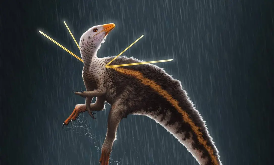 O dinossauro tinha o tamanho aproximado de uma galinha, uma crina ao longo do torço e um par de “fitas”, estruturas rígidas, que não se assemelham a escamas, penas ou pelos, mas que poderiam ser únicas deste animal.