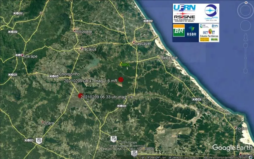Na madrugada desta terça-feira (9), o Laboratório de Sismologia da Universidade Federal do Ceará (LabSis/UFRN) registrou nove tremores de terra no município de Cascavel, distante 70km de Fortaleza. O primeiro ocorreu às 3h32, de magnitude 1.6 na Escala Richter. Em seguida, foi observado o segundo um pouco mais intenso, de 1.8.