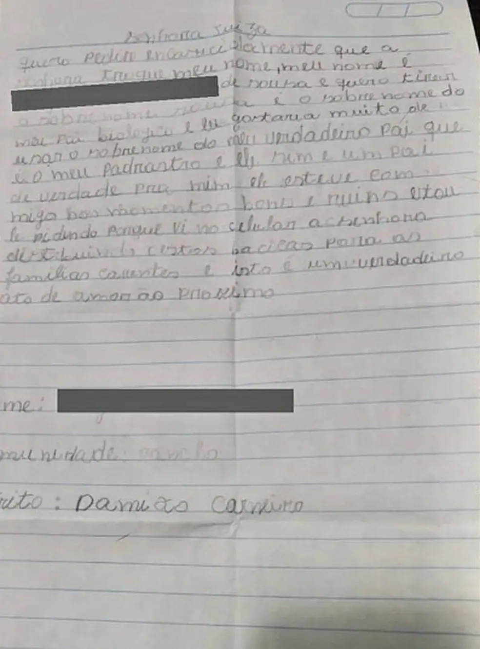 Quando navegava na internet, a criança viu fotos de uma ação social feita pela juíza, em que ela entregou cestas básicas para famílias carentes da região. Na carta, o garoto explica que o agricultor José Adilton de Freitas é seu ‘pai de verdade’, “ele esteve comigo nos momentos bons e ruins”, escreveu.