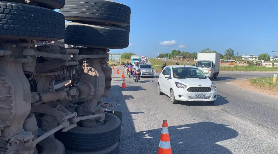 Motorista tenta fazer retorno na BR-116 e tomba carreta em Itaitinga