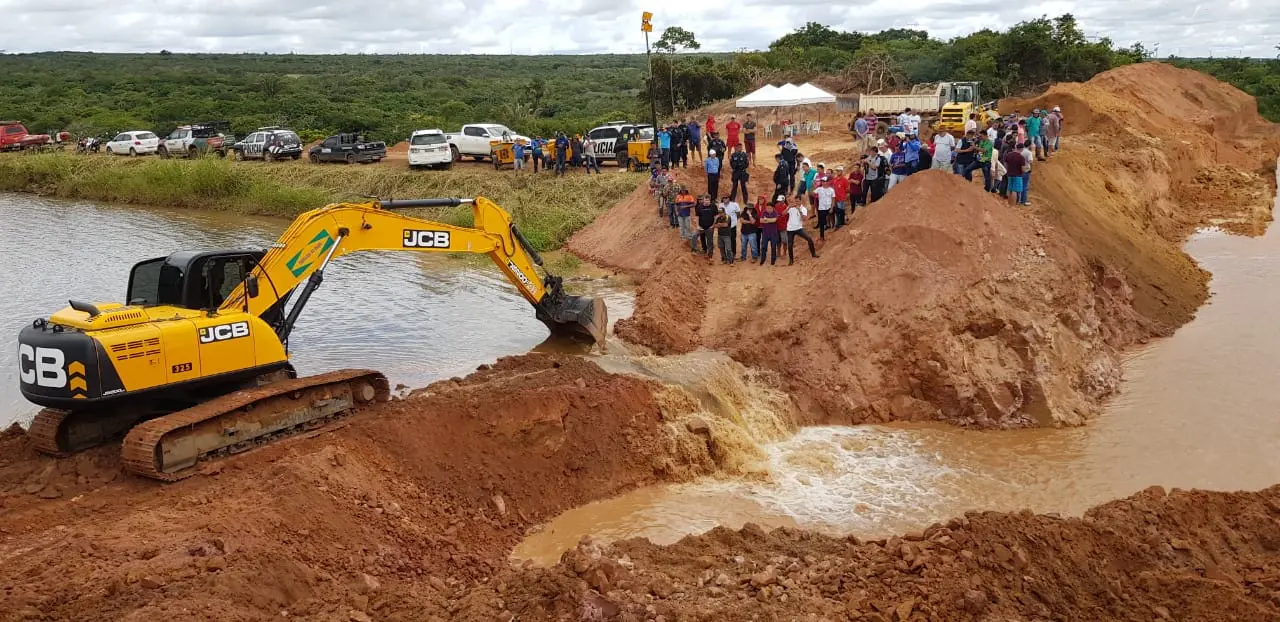 Quatro retroescavadeiras trabalharam durante mais 20 horas na abertura do novo sangradouro do açude, construído na zona rural há 30 anos.