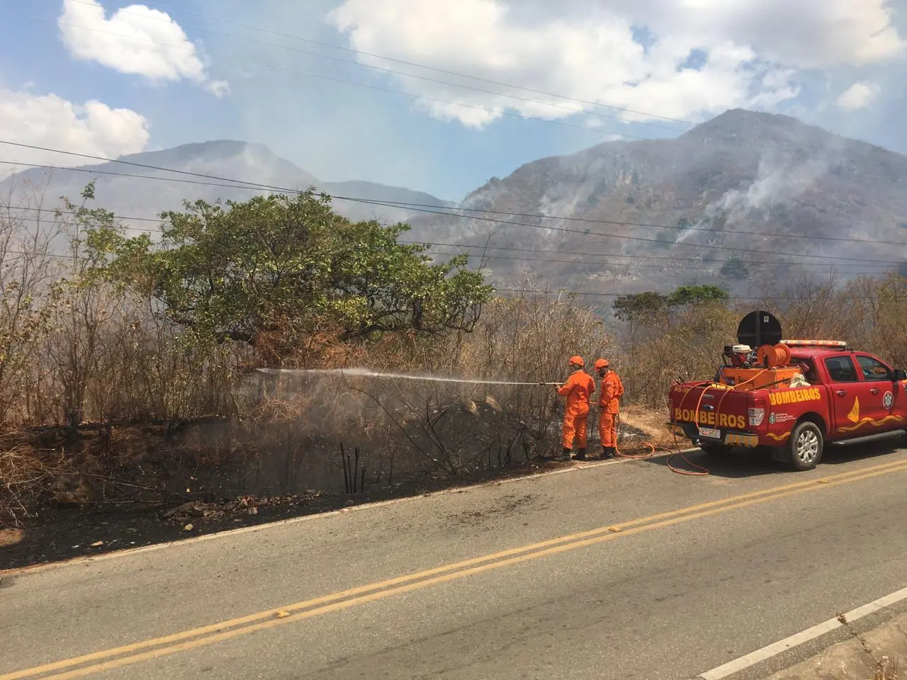 Para controlar as chamas, os bombeiros utilizam bombas costais e abafadores. Além da preocupação do fogo atingir as casas, o trabalho também é realizado para evitar que o incêndio se alastre para a serra, já que não é possível acessar ao local somente com o caminhão.