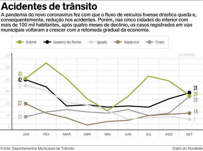 Em Iguatu, na região Centro-Sul, que possui cerca de 102 mil habitantes e soma 53.238 veículos registrados, apesar de também apresentar uma queda de acidentes com a pandemia, o baixo índice permaneceu após a reabertura mais gradual das atividades econômicas. Janeiro (37) e fevereiro (33) lideram o número de ocorrências, que diminuiu continuamente em março (23), abril (21), maio (16), junho (9). A surpresa vem a partir dos meses de julho (10), agosto (11) e setembro (9), os dois últimos após o fim do 'lockdown'.