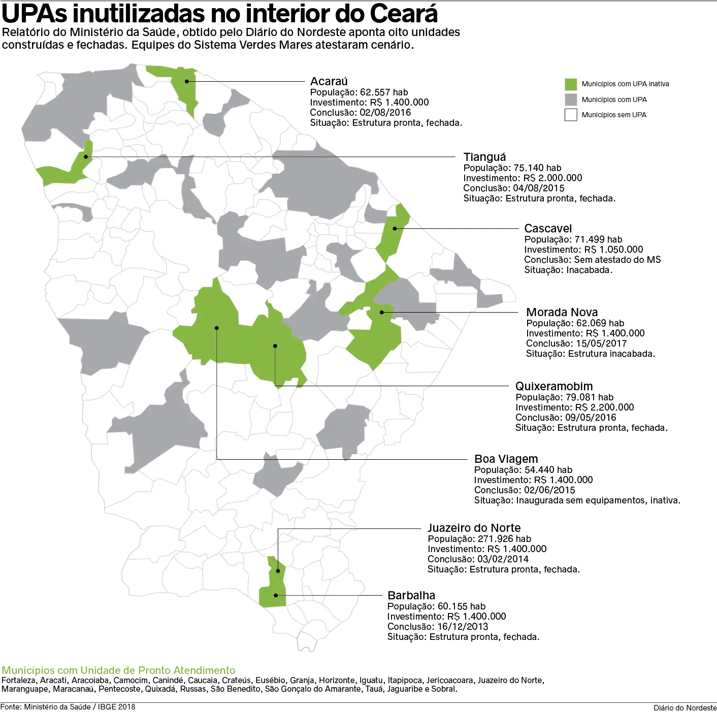 De acordo com o Ministério da Saúde (MS), o Ceará "conta com nove UPAs 24h já com atestado de conclusão emitido: Acaraú, Barbalha, Boa Viagem, Cascavel, Juazeiro do Norte, Morada Nova, Quixeramobim, Sobral e Tianguá", mas ainda aguardando "contratação de pessoal e aquisição dos equipamentos para funcionamento". A Pasta federal garante que "as unidades já foram habilitadas e estão com os repasses de incentivo financeiro de investimento efetuados".