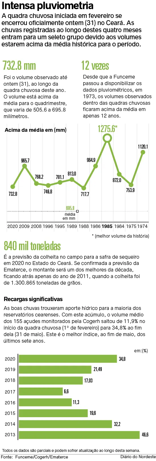 As condições fizeram com que esta quadra chuvosa atingisse alguns parâmetros que não se repetia há anos. Ontem (31), o volume acumulado no Ceará, de fevereiro a maio, alcançou 732,8 mm, ficando 22% acima da normal climatológica. Segundo a Funceme, quando o acumulado nos quatro meses fica entre 505.6 mm e 695.8 mm, o período é considerado "em torno da média"; e abaixo de 505.6 mm, o órgão considera "abaixo da média". Neste século, somente as quadras chuvosas de 2009 (965.7 mm), 2008 (768.2 mm) e 2020 ficaram acima da média.