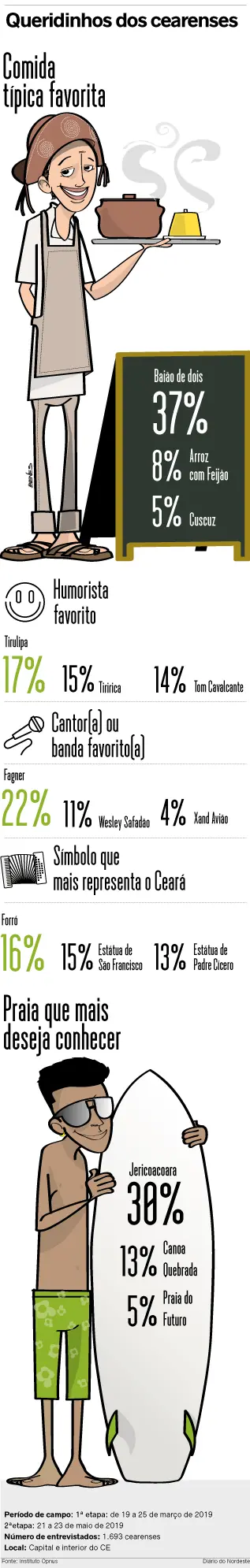 Entre março e maio, mais de 1.500 pessoas foram ouvidas na Capital e no interior do Ceará. O estudo aponta a comida típica, o cantor e o humorista favorito dos cearenses, bem como a praia mais desejada e o ícone do Estado