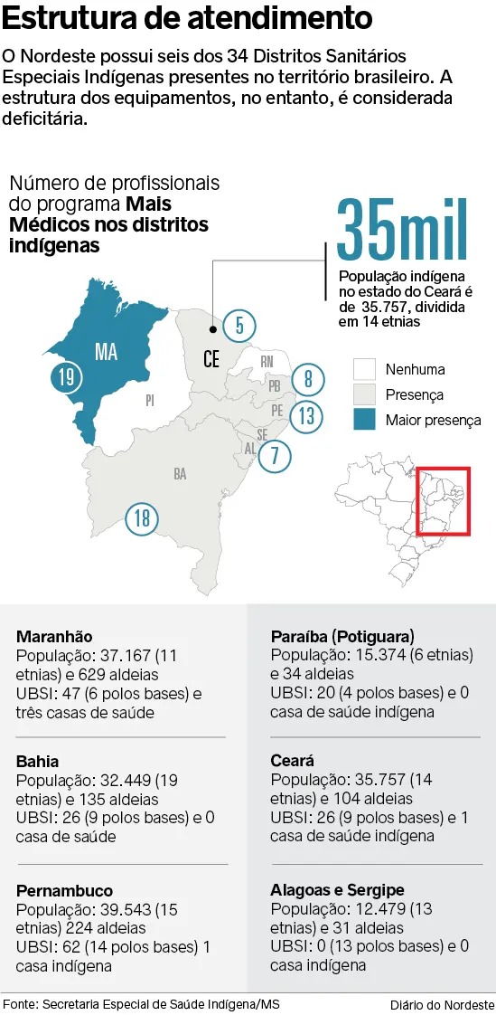 O Ceará conta com apenas cinco profissionais do Programa Mais Médicos (PMM) que atuam no Distrito Sanitário Especial Indígena (Dsei) local, unidade gestora do Subsistema de Atenção à Saúde Indígena (SasiSUS). Dos estados do Nordeste com Distritos, é o que tem o menor número de profissionais do PMM, ficando atrás do Maranhão (19), Bahia (18), Pernambuco (13), Paraíba (8), Alagoas e Sergipe (7). Piauí e Rio Grande do Norte não possuem DSEIs, segundo o Mapa de Atuação do Programa Mais Médicos.